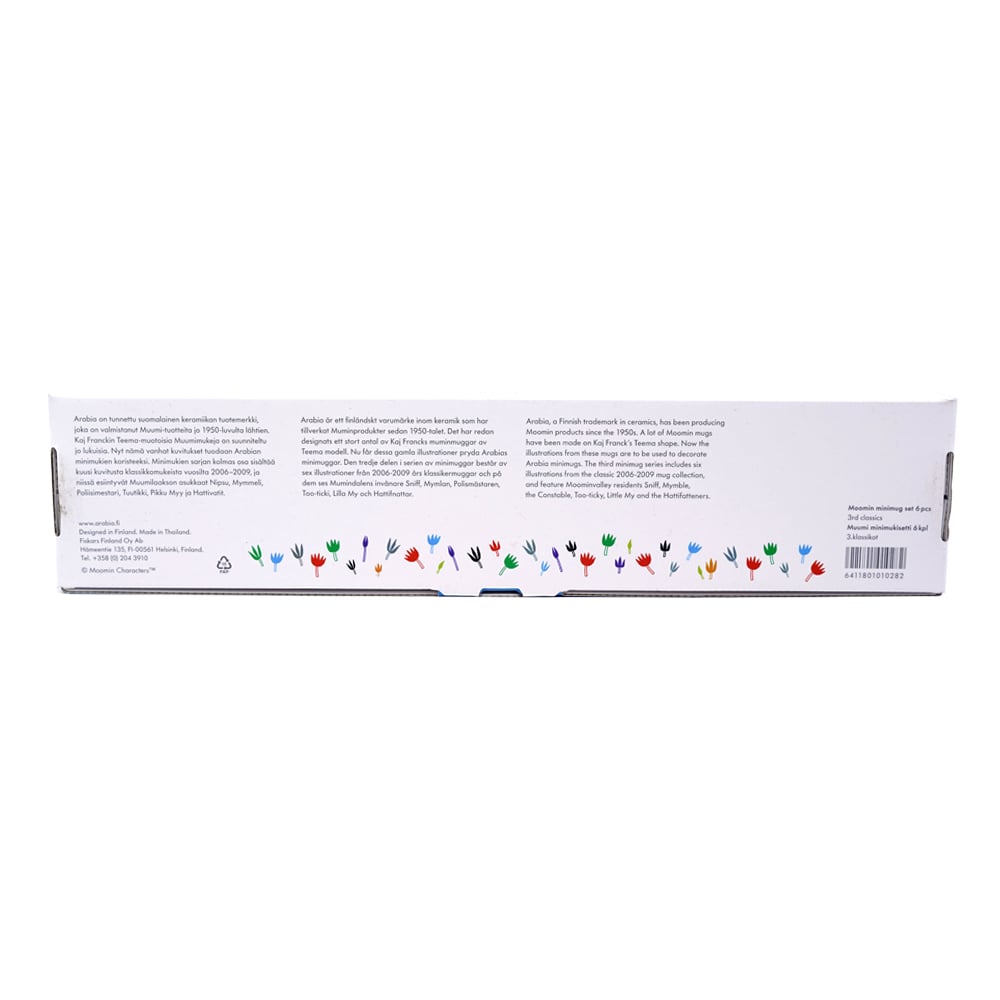 Moomin mini mugs 3rd classics continued Arabia’s tradition of introducing mini mug versions of the Teema-shaped character mugs. The first mini versions were launched in 2019. The third set of classic mini mugs consists of six different character mugs that were initially launched between 2006 and 2009. These six mini mugs feature the following Moomin characters: Too-ticky, Hattifatteners, Little My, Mymble, Sniff and the Inspector. The volume of a single mini mug is 12 ml.