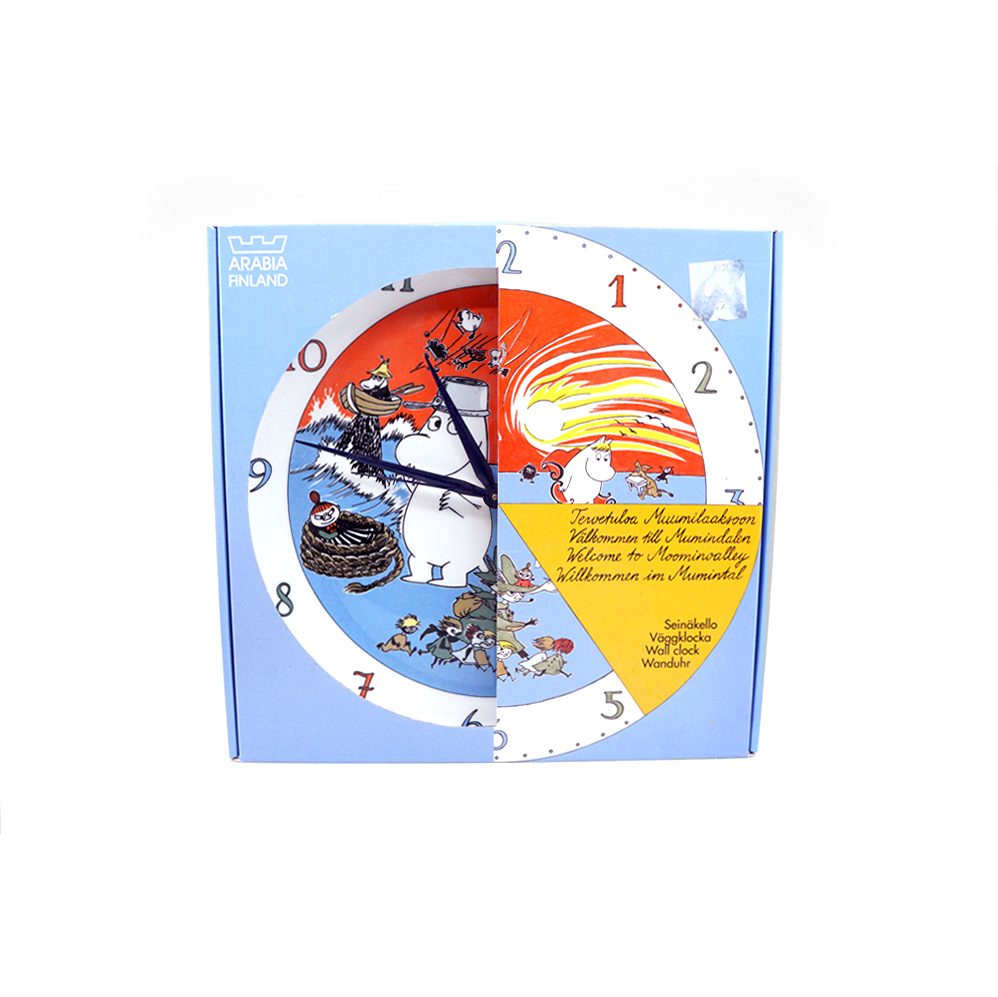 Moomin wall clock Comet in Moominland was in production for only three years from 2005 to 2007. The graphic designer is Tove Slotte, who’s also behind most of the Moomin mug designs. The diameter of the wall clock is 29 centimeters.
