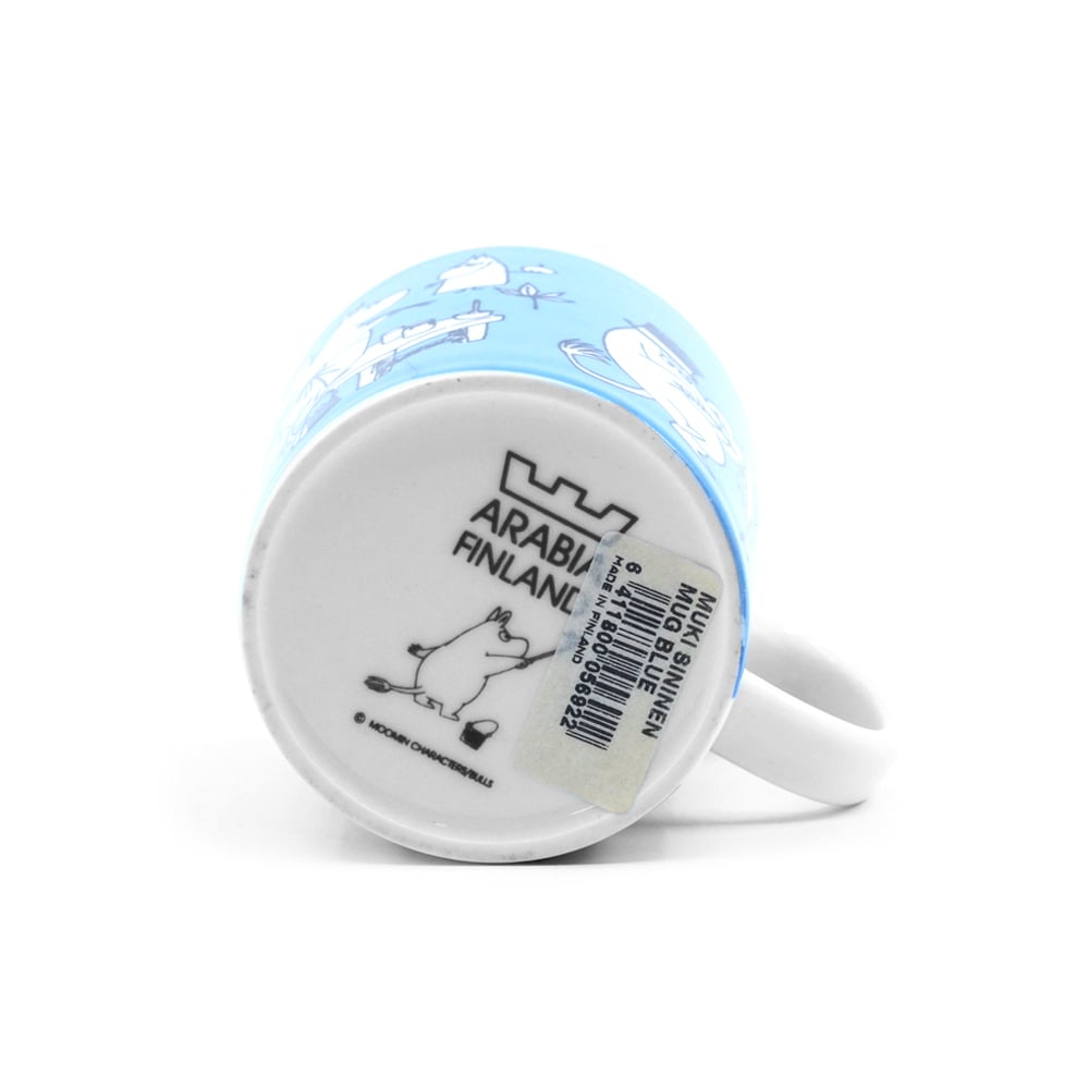 Arabias muminmugg Mugg blå (ur produktion). Muggen är ny och har etiketten kvar. Det finns endast ett, som uppkommit under produktion, färgfel på muggen (bild #1, nedre hörn till vänster). Färgerna på muggen är mycket starka och muggens glasyr har en fantastisk glans. Muggar från 90-talet med etikett kommer allt mer sällan emot. Muggarna packas med omsorg och förnybara material.