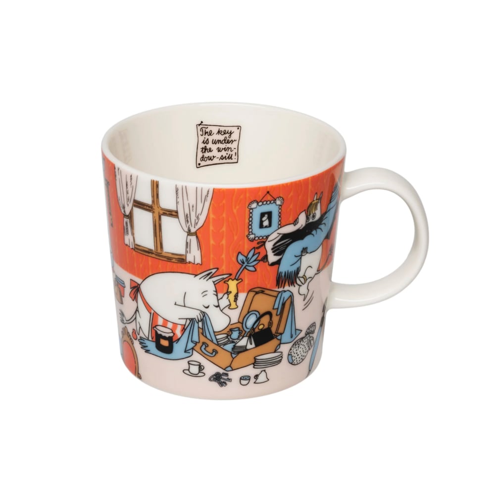 Lomakuumetta-kokoelman mukin sisäpintaa koristaa hauska yksityiskohta: muistilappu, jossa lukee “The key is under the window-sill!” (suomeksi: “Avain on ikkunalaudan alla!”). Ensimmäistä kertaa tämän kaltainen yksityiskohta nähdään myös muumilautasessa, sillä samainen painatus muistilapusta löytyy lautasen reunalta.