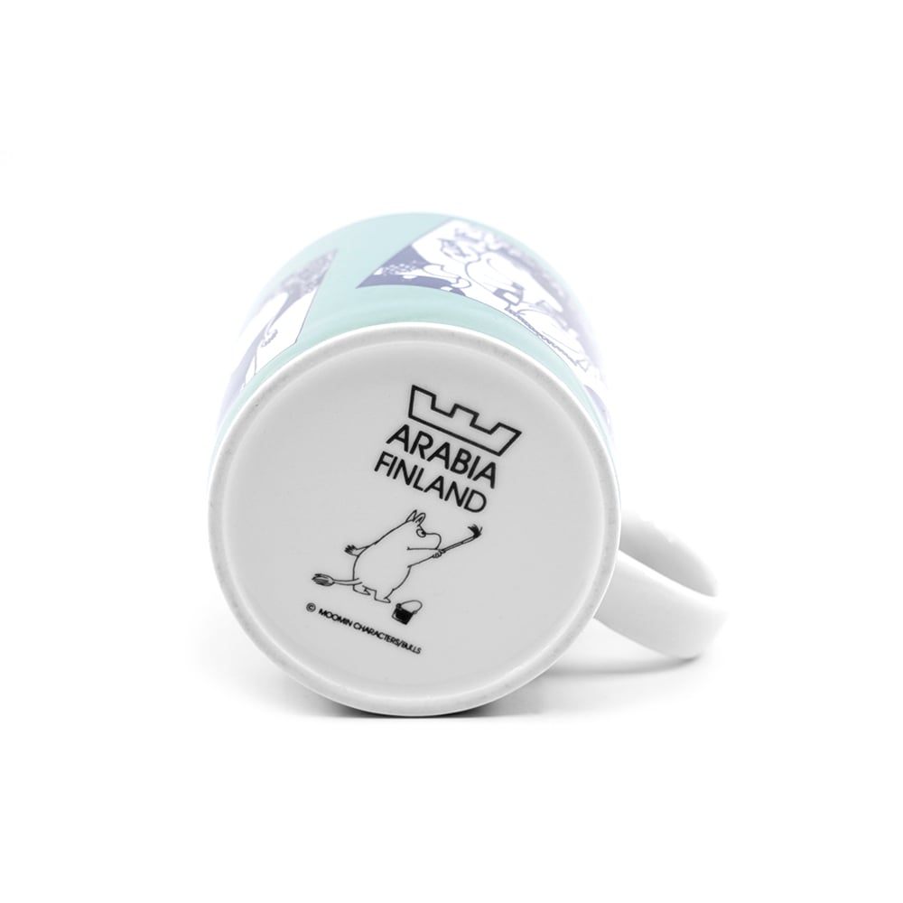 Muumimuki Muki vihreä ilmestyi vuonna 1990. Muki tunnetaan myös nimellä Vihreä sarjakuva. Jo ensimmäisiin muumimukeihin haluttiin myös pohjaleima, jossa Arabian oman leiman lisäksi on viittaus muumeihin. Sama kuva maalaavasta muumista on kulkenut mukana liki jokaisessa sittemmin ilmestyneessä muumimukissa muutamaa erikoispohjaleimaa lukuun ottamatta. Aivan ensimmäisissä tuotantoon tulleissa mukeissa vuodelta 1990 oli muista mukeista poikkeava Arabian Teema-leima. Teema-leimalla varustetut mukit ovat huomattavasti muita versioita harvinaisempia. Katso video Muki vihreästä Youtube-kanavaltamme.