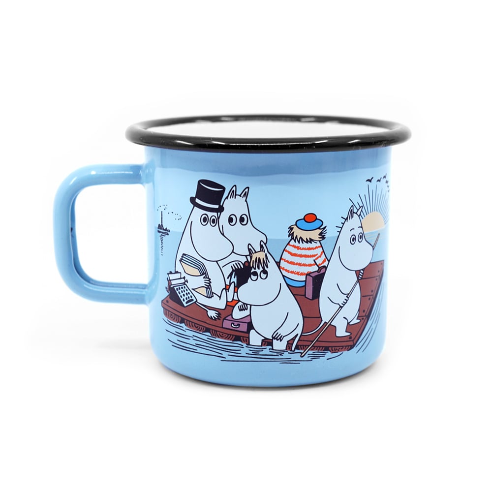 Tallink Siljan vuoden 2017 emalimukin merihenkisessä kuvituksessa Muumiperhe on lauttailemassa.